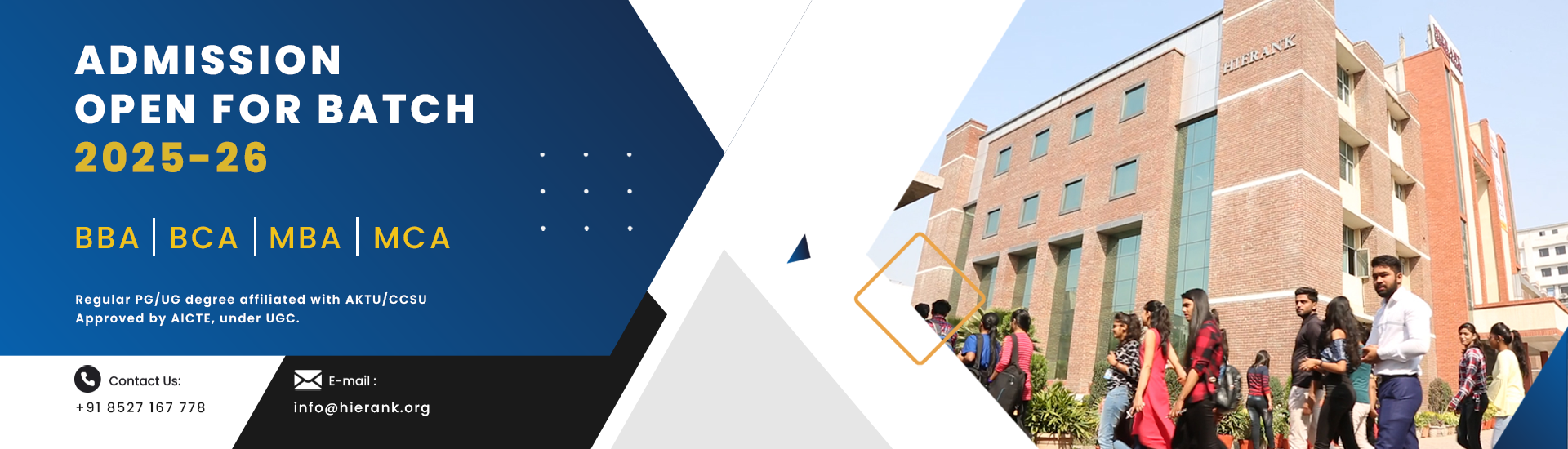 Click HereHierank Business School, Noida is an Integrated campus Approved by AICTE, Under Min of HRD, Govt.of India. MBA Program is affiliated to Dr. Abdul Kalam Technical University (Formerly UPTU), Lucknow and Graduate Programmes (BBA, BCA/B.ED) are affiliated to CCS University Meerut, under UGC. All UG & PG programmes run under the Umbrella of ABR Education Foundation, which is a non-profit making body, constituted by a group of leading academicians and industrialists. Hierank Business school is established in 2006 by Prof Rajesh Sahay ( Former Director Amity ) It is ideally located inside National Capital Region, Sector 62 of Noida Institutional Area, adjoining South Delhi. A well-planned city & India's most prominent Industrial & Software development hub, evolving as knowledge center, Noida is just 40 Kms from Gurgaon another great hub for MNC's & Corporate. This geographical advantage gives us ample scope for industry-academia partnership, there by leading to abundant placement opportunities to our students. Hierank is ranked among the top MBA colleges in Delhi NCR in terms of students satisfaction and development.