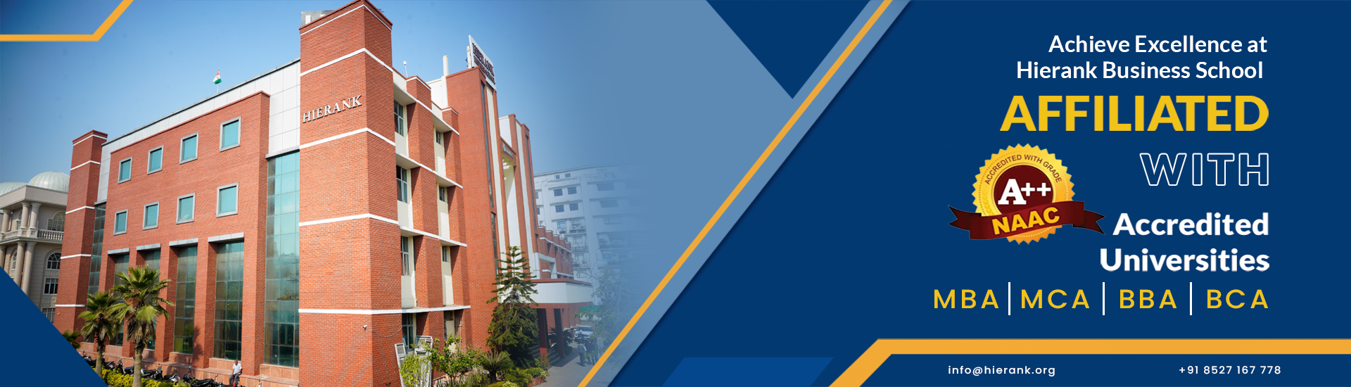 Hierank Business School, Noida is an integrated campus approved by AICTE under the Ministry of HRD, Govt. of India. The MBA program is affiliated with Dr. Abdul Kalam Technical University (formerly UPTU), Lucknow, and the graduate programs (BBA, BCA/B.Ed) are affiliated with CCS University Meerut, under UGC..